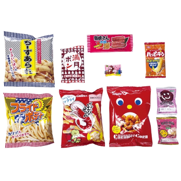 カルビーのかっぱえびせんをはじめ、東ハトのキャラメルコーン、湖池屋のスコーンなどメジャーで人気のお菓子を10点詰め合わせました。