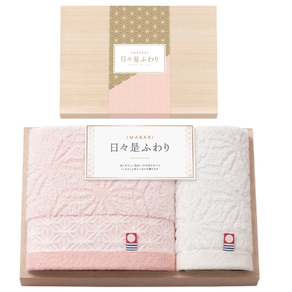 淡くやさしいピンクとアイボリーの「紅白」を思わせる色彩で織り上げたパイルのやさしい肌触りをふわりと感じる今治タオル。繊細な模様にあしらったのは縁起のいい「麻の葉模様」。麻はすくすくとまっすぐに伸びることから成長を願う柄とされ、古くから愛され続けています。木箱入りの上品な佇まいで「感謝」を込めた大切な贈りものとして最適です。
