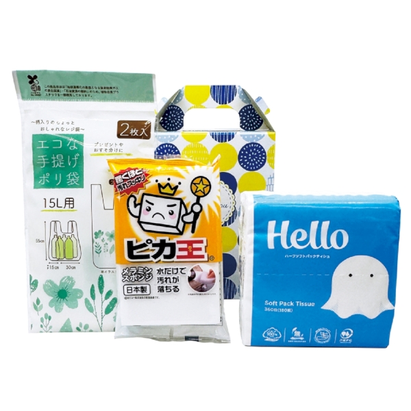 コンパクトサイズのソフトパックティッシュやお掃除で使用できるメラミンスポンジや手提げポリ袋など便利なアイテムを取り揃えております。