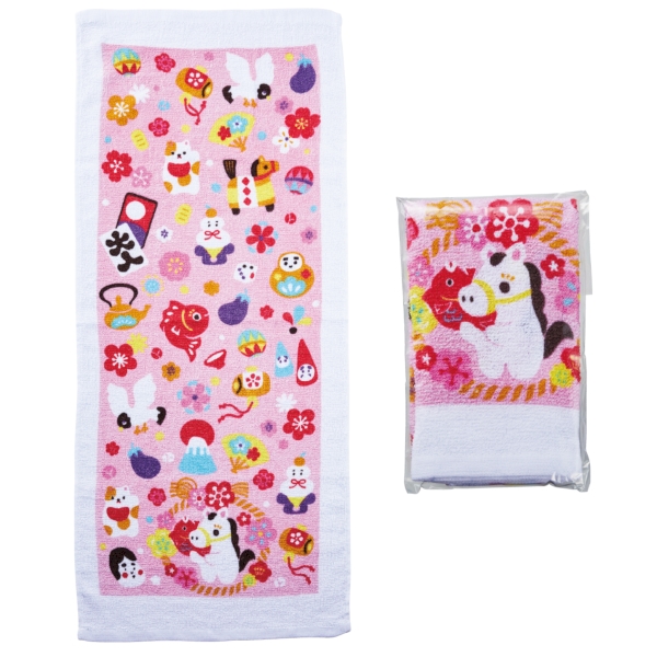 お正月を彩る晴れやかなデザインが細かなところまでプリントされているお年賀タオルです。
