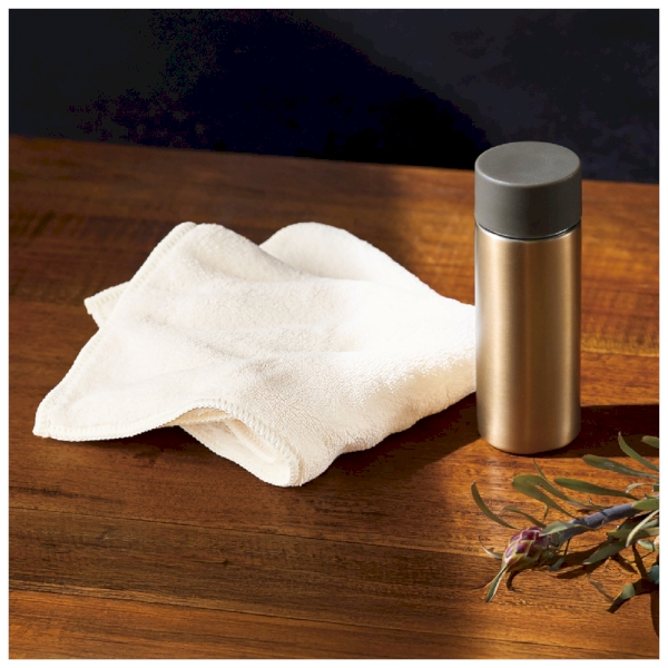 ゴールドパッケージに納めた、おでかけ時にセットで使えるミニボトルとハンドタオルのギフトセット。