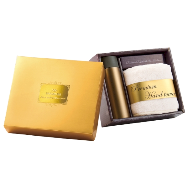ハンドタオルにはゴールドの帯を巻いて、箱を開けた時の驚きまでもプレミアム。贈答品に最適な身蓋式の化粧箱がその価値をさらに高めます。