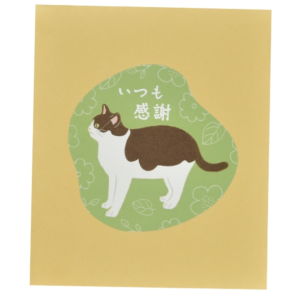 リラックスしたにゃんこが目印。 ありがとうございます/ほんの気持ちです/いつも感謝 の3種類のメッセージをご用意しています。(中身共通) それぞれ50個単位150個以上(以降50個単位)でお申込みいただけます。