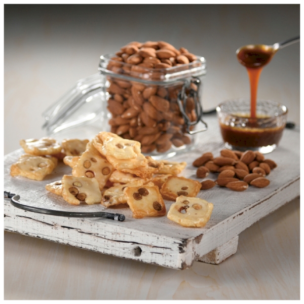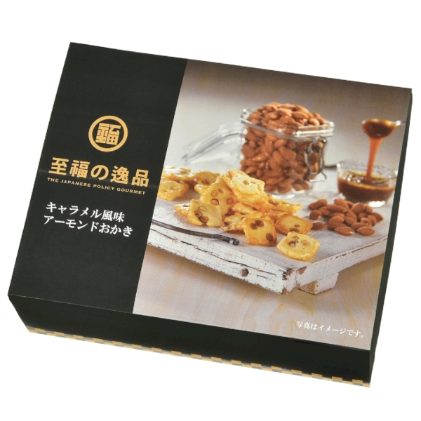 和風のおかきと洋風のキャラメル&アーモンドのマリアージュ!香ばしさとともに甘じょっぱい味わいがあと引く美味しさです。