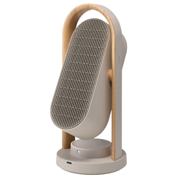 木目調のフレームとモダンなカラーのインテリア性の高さと、持ち運びやすさが特徴のセラミックヒーター。