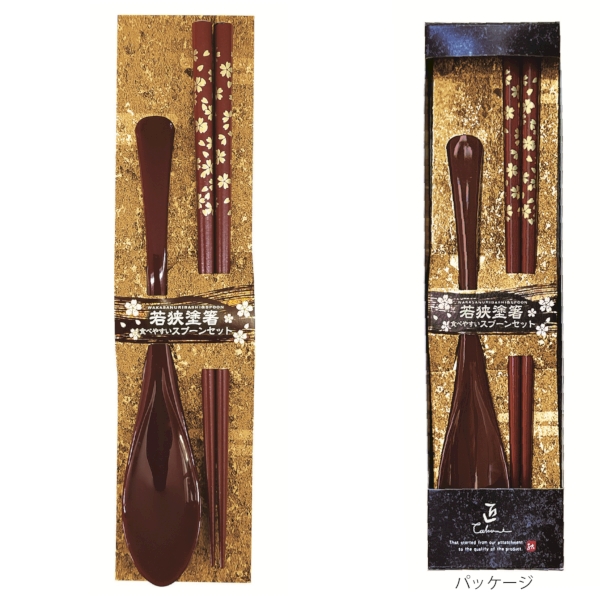 華やかな台紙が特別感を演出。艶が美しい若狭塗と上品な花模様、形状にもこだわった日本製カトラリー。