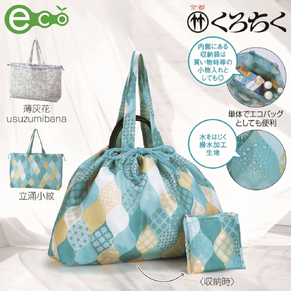 涼しい色味と文様で構成されたモダン和柄に、持ち手部分に伊砂文様のロゴとタッセル付き。